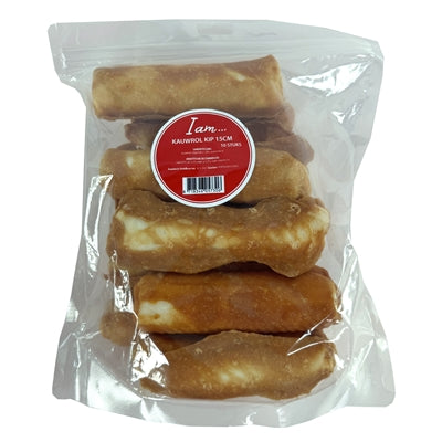De I am Kauwrol Kip 15 cm 10 st is een lekkere kauwsnack bestaande uit runderhuid gewikkeld in gedroogde kip, zonder suiker en glutenvrij. De kauwrol is gemaakt van extra dikke runderhuid, om op te kauwen. Kauwen op runderhuid gaat verveling tegen en helpt bij het verzorgen van het gebit, omdat de huid langs de tanden wrijft en zo tandplak en tandsteen helpt te verminderen. De rol is omwikkeld met een jasje van gedroogde kip voor extra smaak en stimulans.