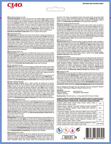 Analytische bestanddelen: Ruw eiwit (min) 7%, ruw vet (min) 0,2%, ruwe vezels (max) 0,3%, vocht (max) 91%, Vitamine E (min) 310 IU/kg, taurine (min) 0,025%