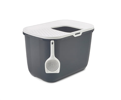 De Savic Kattenbak Hop In Antraciet/Wit 58,5X39X39,5 cm is een moderne kattenbak met boveninstap. Als jouw kat staand plast of veel graaft in de bak, heb je met een normale kattenbak vaak veel troep buiten de bak op te ruimen. Deze Hop In kattenbak van Savic heeft hoge zijkanten en een opening aan de bovenkant in plaats van de voorkant. Hierdoor blijft al het grit, urine en ontlasting mooi in de bak. Voor extra hygiëne is het deksel licht aflopend en voorzien van kleine gaatjes: als de kat over het deksel loopt bij het verlaten van de bak, valt de kattenbakvulling zo weer de bak in.