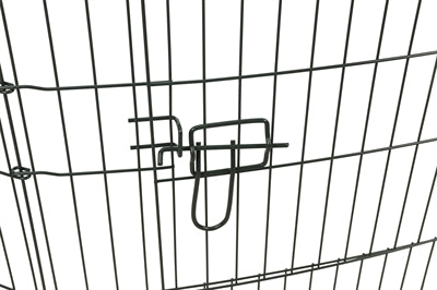 De ren bestaat uit acht panelen en is voorzien van een deur. De maaswijdte is 1X1 cm.