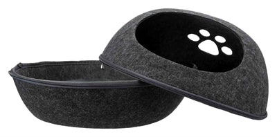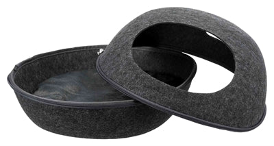 Deze Trixie Relax Iglo Liva Kattenmand Antraciet 40X24X47 cm is een heerlijk mandje met een ronde vorm. In dit mandje zou je het liefst zelf willen gaan liggen! Dit gezellige kattenhuisje is rond van vorm, met aan de voorkant een gat dat toegang biedt voor de kat. Heerlijk veilig en knus slapen dus! Het huisje is gemaakt van vilt (polyester), wat er niet alleen leuk uitziet, maar er ook voor zorgt dat het huisje isolerend en vuilafstotend is. Het huisje komt met een kussen met polyestervlies vulling en pluche bekleding. Ook heeft de iglo een ritssluiting rondom, en kun je het gehele mandje in elkaar plaatsen en dus ruimtebesparend opbergen. Een heerlijk knus en origineel mandje voor jouw kat!