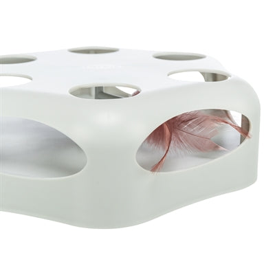 De Trixie Turning Feather Assorti is een interactief speeltje voor nieuwsgierige katten. De veer in het midden beweegt onvoorspelbaar heen en weer, stopt af en toe en verandert willekeurig van richting – perfect om het jachtinstinct van je kat te prikkelen. Het speeltje kan worden gevuld met kleine beloningssnoepjes voor extra motivatie. Dankzij de rubberen voetjes blijft het stevig staan tijdens het spelen. Na ongeveer 15 minuten schakelt het automatisch uit. Werkt op 3 AA-batterijen (niet inbegrepen).